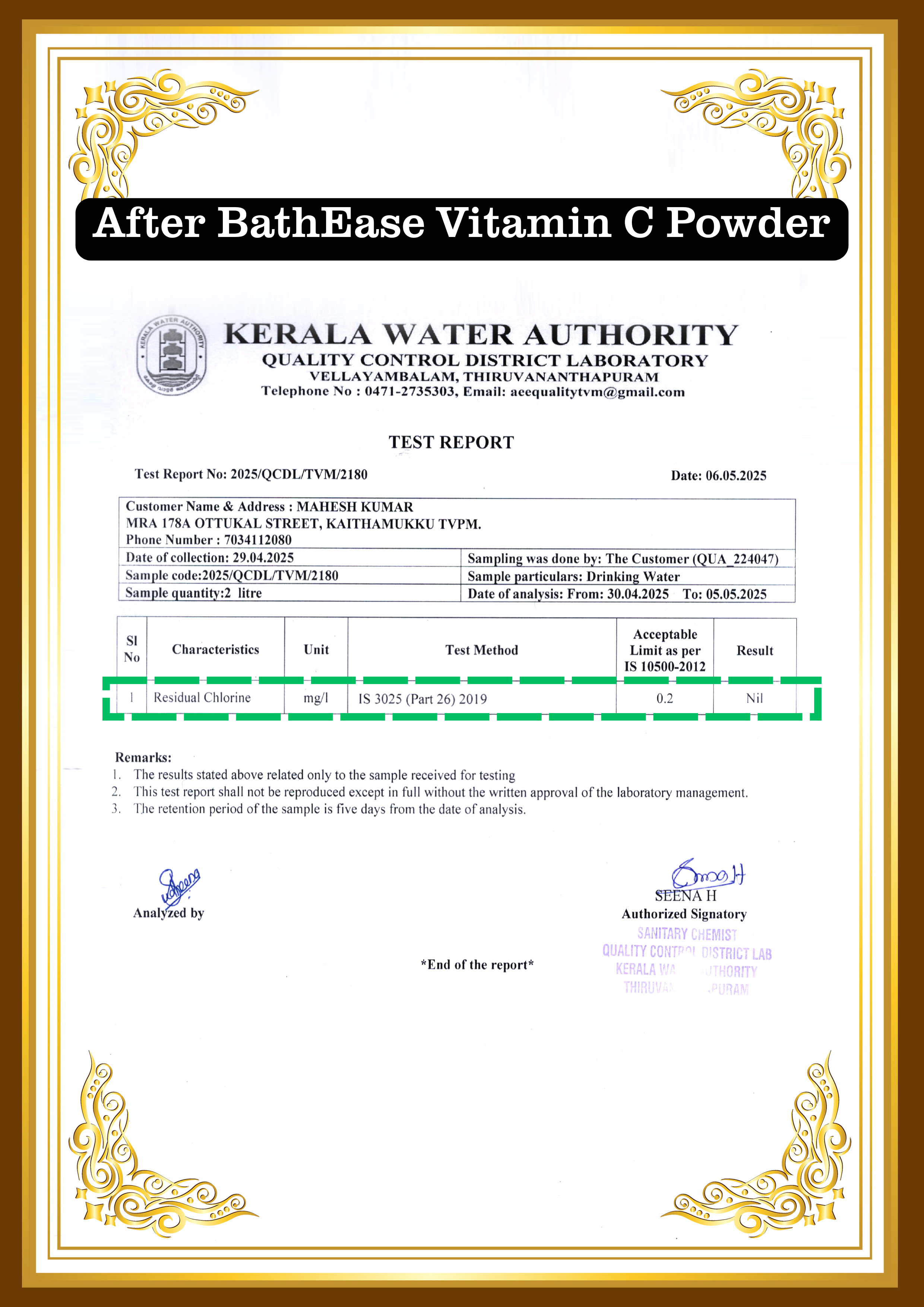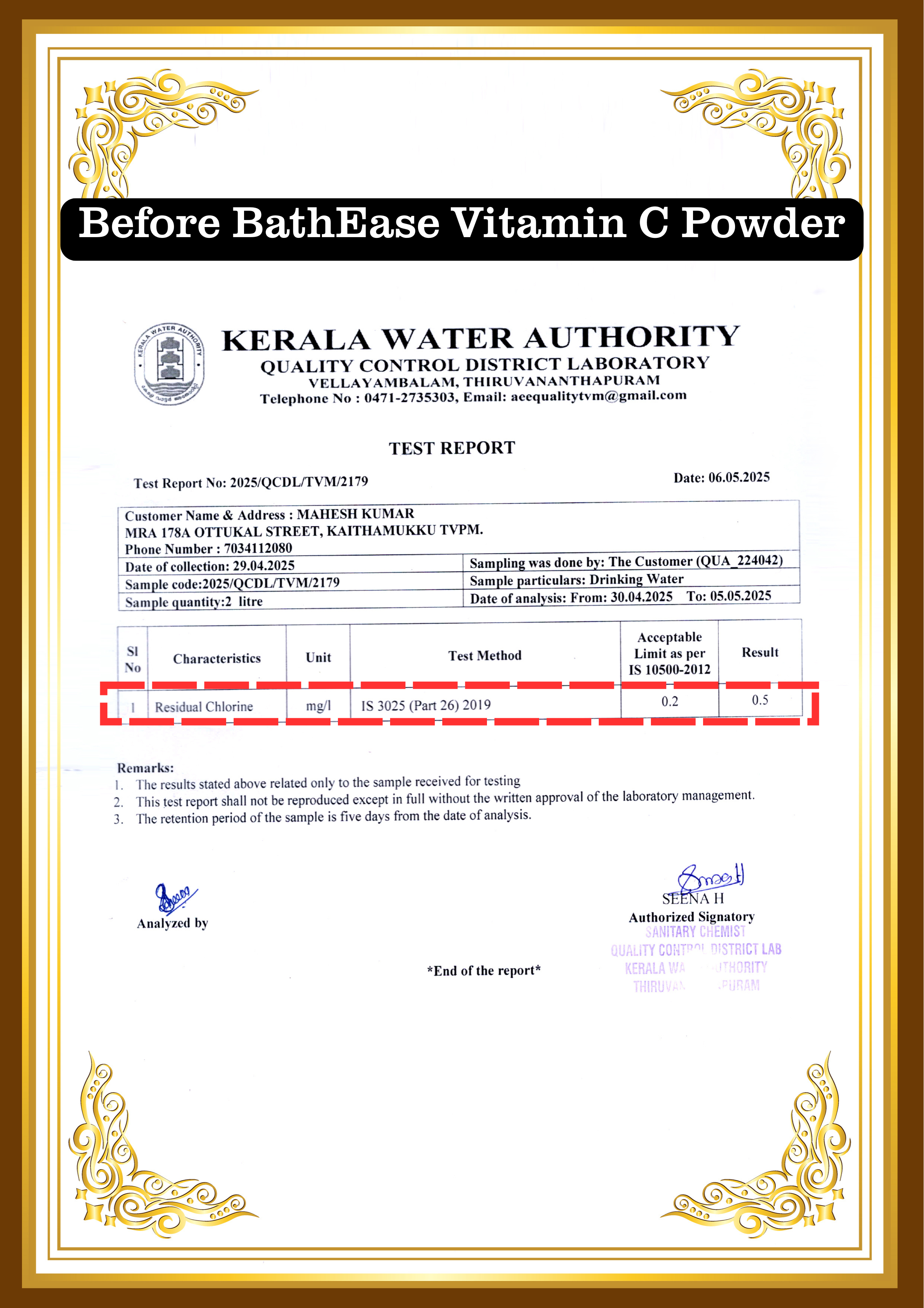 Lab Results of BathEase Vitamin C Chlorine Removal Powder