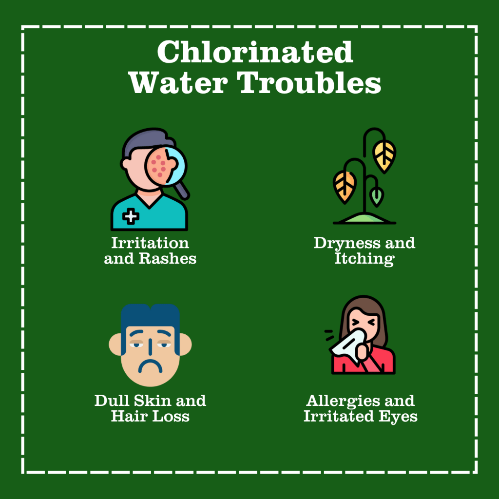 Even though chlorine is effective against microorganisms, it can cause various issues related to skin and hair like discoloration & dullness of skin, hair loss, dryness and itching on your scalp and skin, dry and