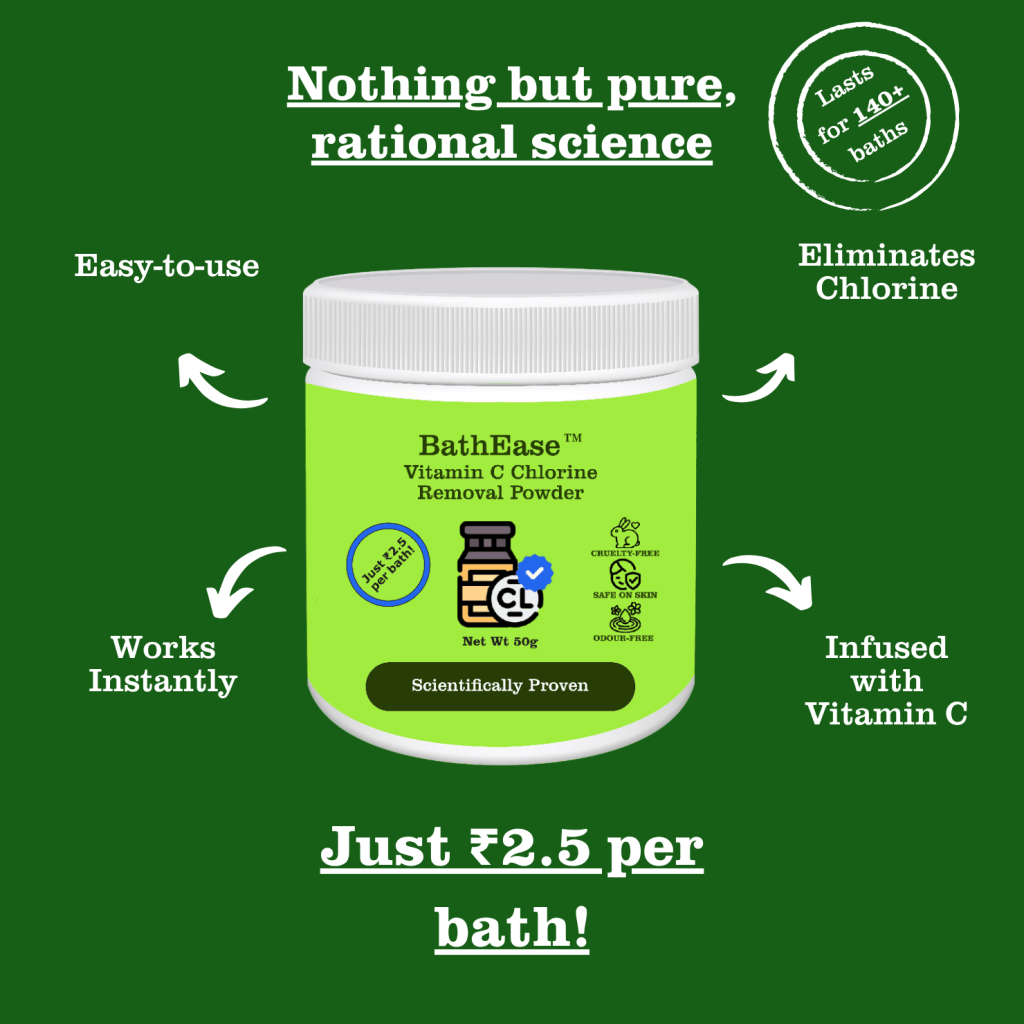BathEase Vitamin C Chlorine Removal Powder effectively nullifies the downsides caused due to chlorine in bathing water.